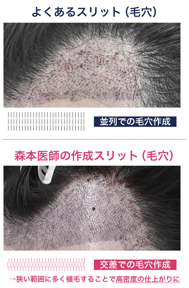 毛を植えるための毛穴を作成する「スリットメイキング」という工程で、通常であれば並列にスリット(毛穴)を作成する医師がほとんどです。