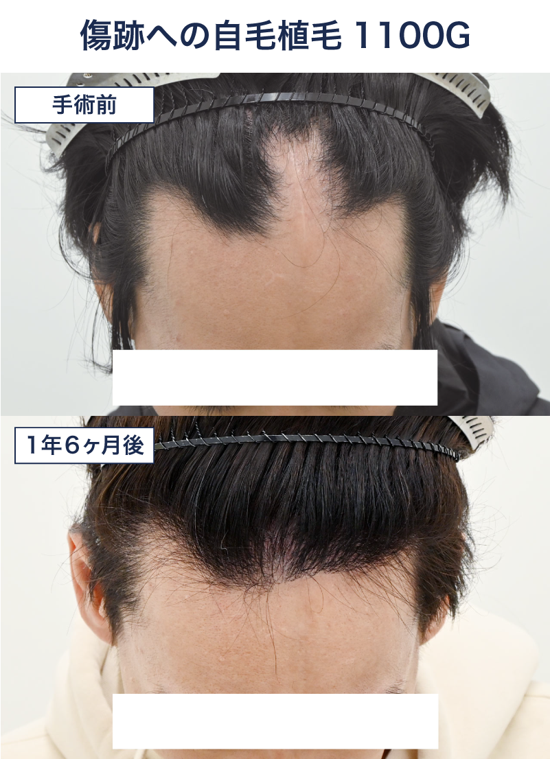 範囲の広い瘢痕でしたが、合計1100グラフトの植毛でしっかりと改善ができています。