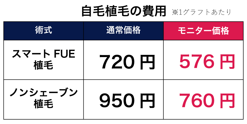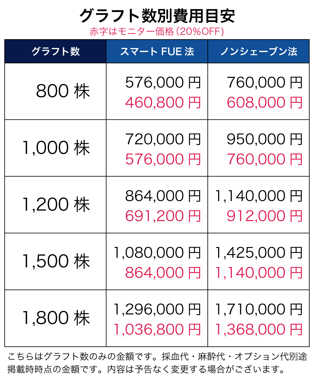 1グラフトあたりの料金は植毛メニューにより異なります。