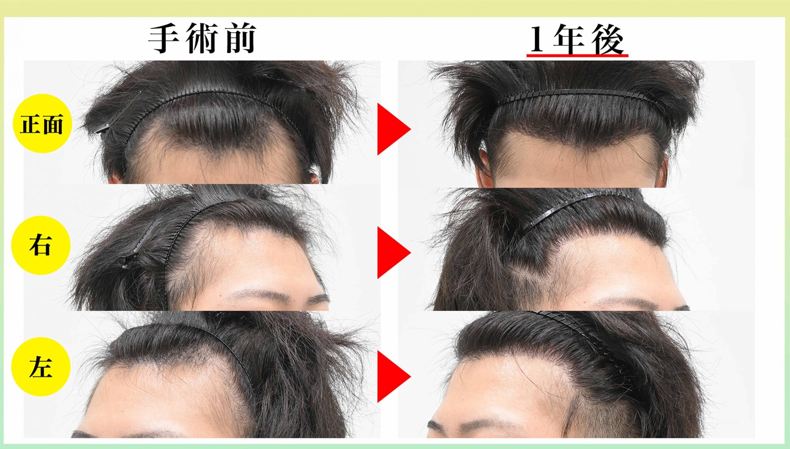 手術前と手術後1年後では、ヘアラインがしっかりと補強され、なだらかなヘアラインに変化していることが分かります。