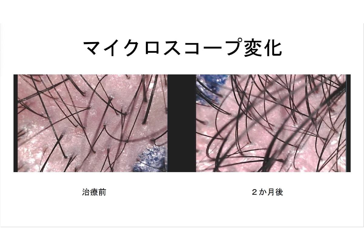 治療開始からわずか2ヶ月後の経過ですが、マイクロスコープで確認したところ、術前と比較して1本1本の毛髪が明らかに太く、力強く成長しているのが確認できました。