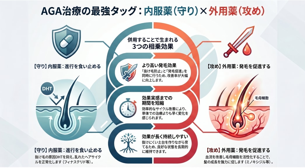 外用薬は血流を促進し、毛根に直接作用することで発毛をサポートします。 一方で、AGAの原因を抑える力は内服薬の方が強いため、 外用薬は「生やす力(攻め)」の役割と考えると分かりやすいです。