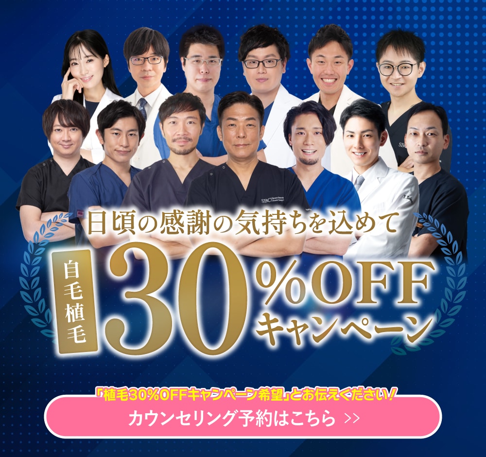 日頃の感謝を込めて、植毛手術が30%OFFになる特別キャンペーンを期間限定で実施します。