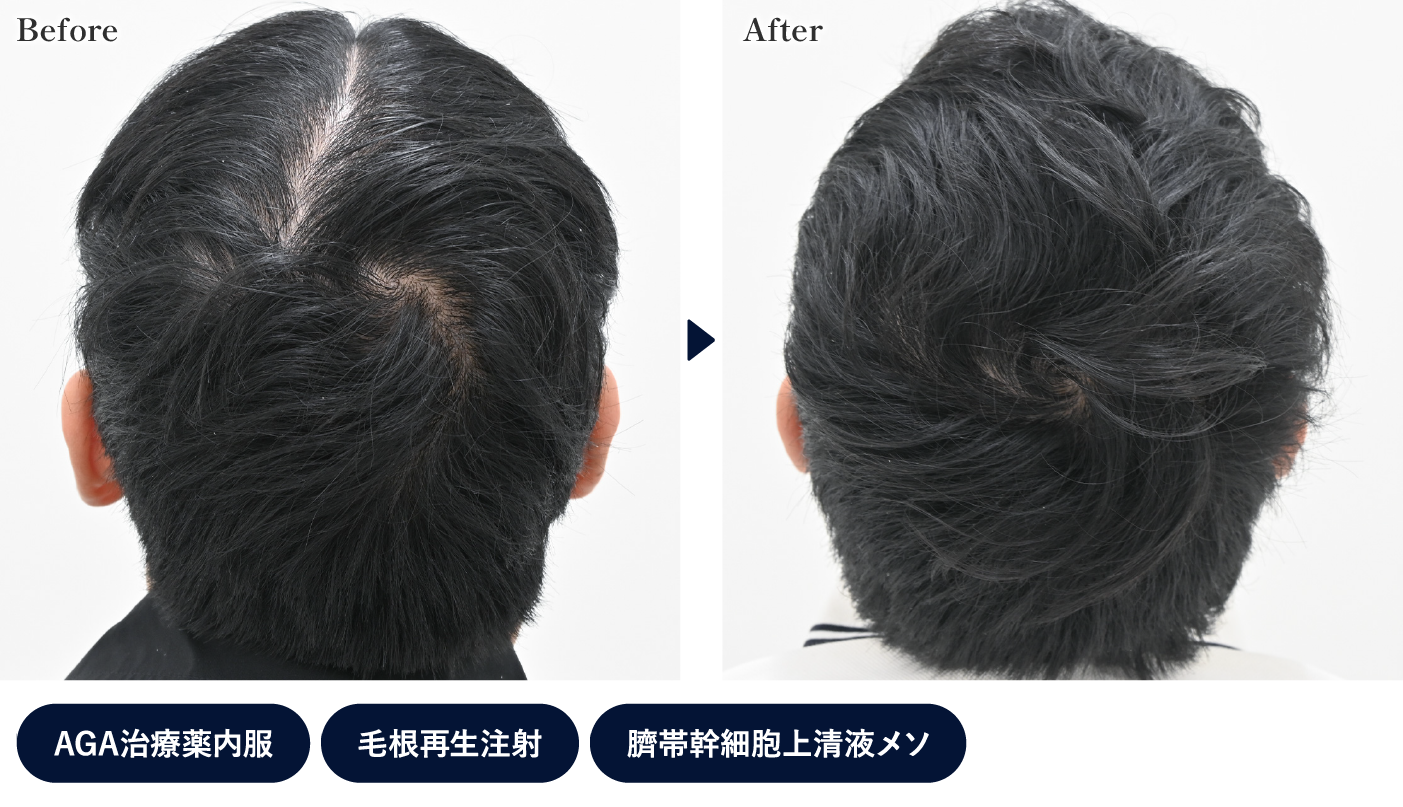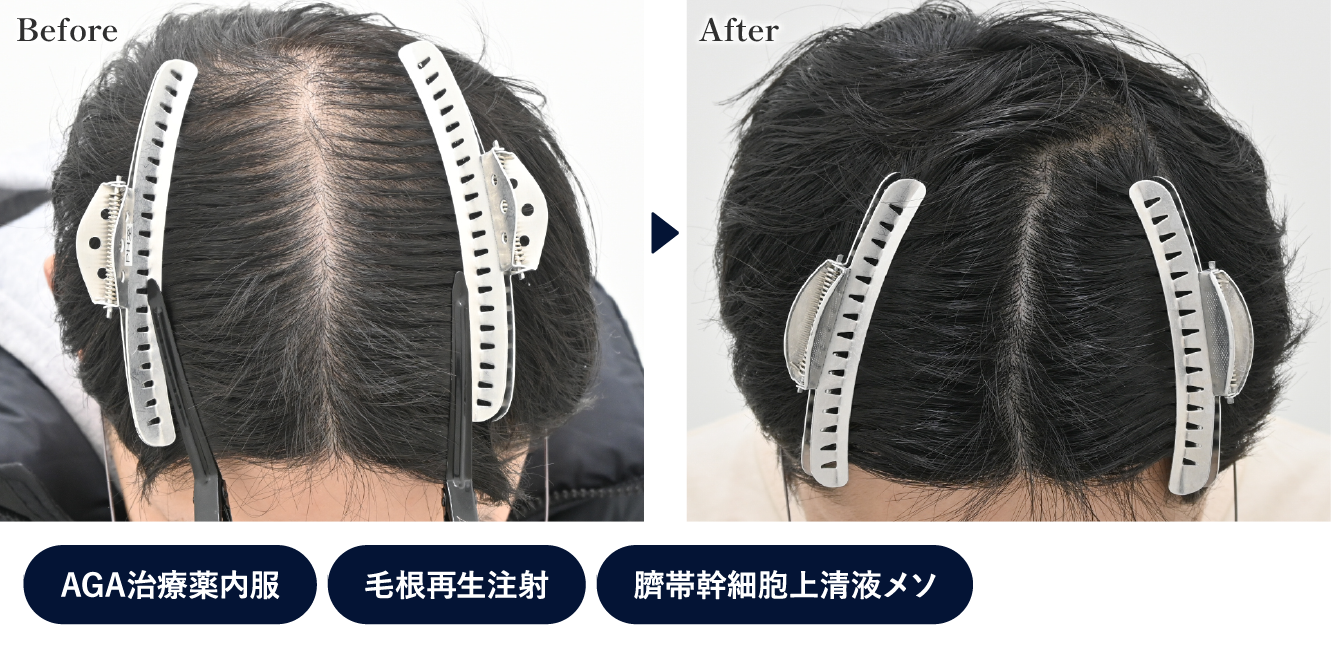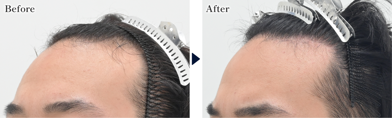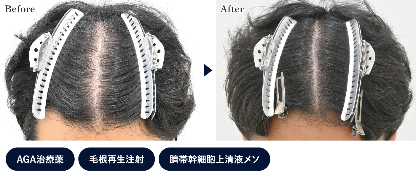 頭頂部の分け目がかなり狭くなり、全体のボリュームも増えています。生え際(M字)も、毛根が残っている部分に再生注射を行ったことでボリュームが改善しました。