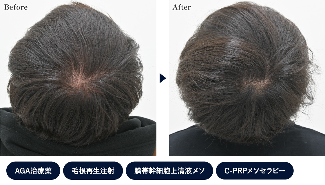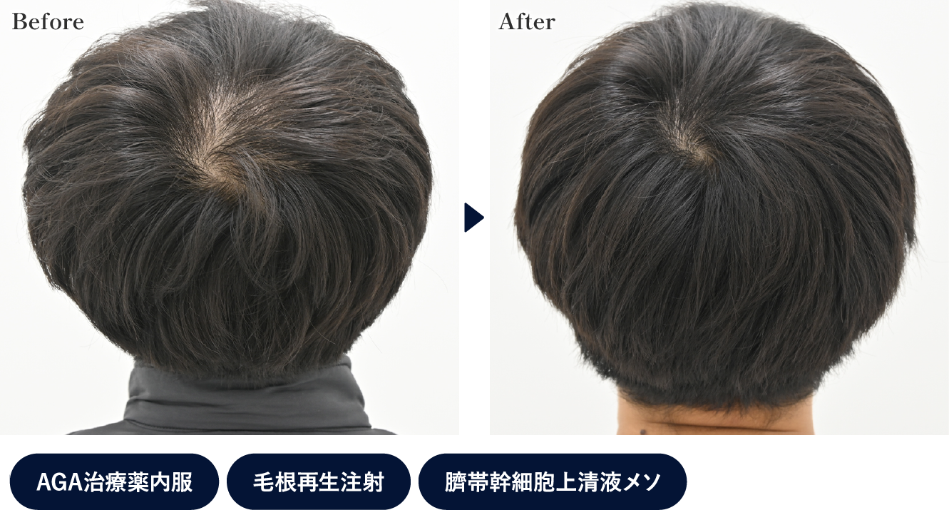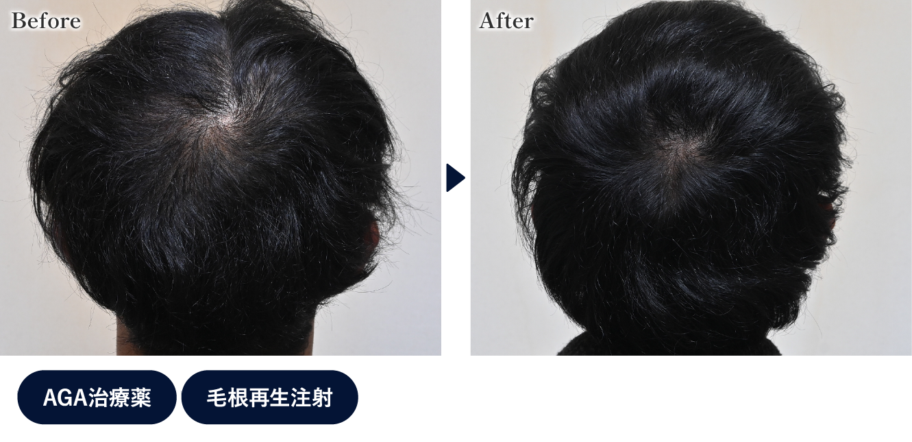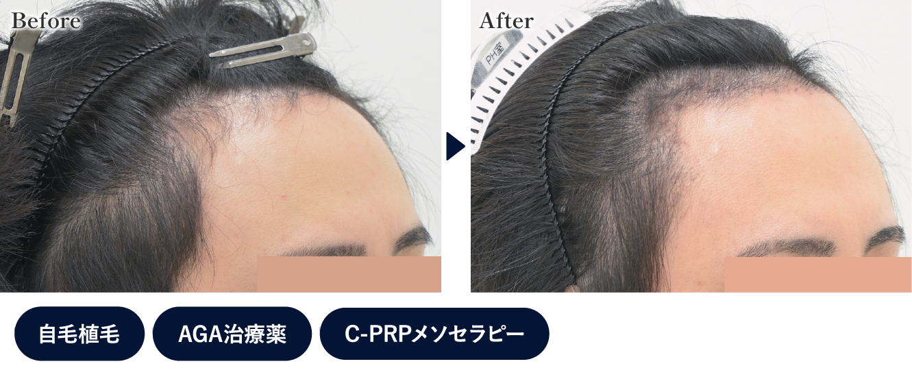 頭頂部の分け目がかなり狭くなり、全体のボリュームも増えています。生え際(M字)も、毛根が残っている部分に再生注射を行ったことでボリュームが改善しました。