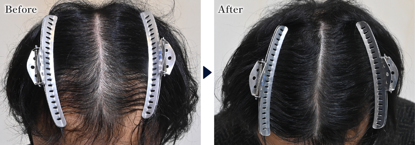 つむじ周りの透け感がなくなり、髪を左右に分けた分け目も細くなり、かなり改善しています。