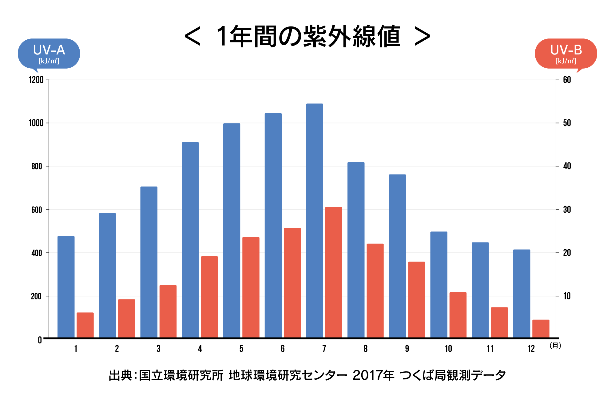 肌を赤く炎症させる、分かりやすい「夏の日差し」の正体です。7月をピークに夏場は突出して高くなりますが、冬場はガクッと大きく減少します。