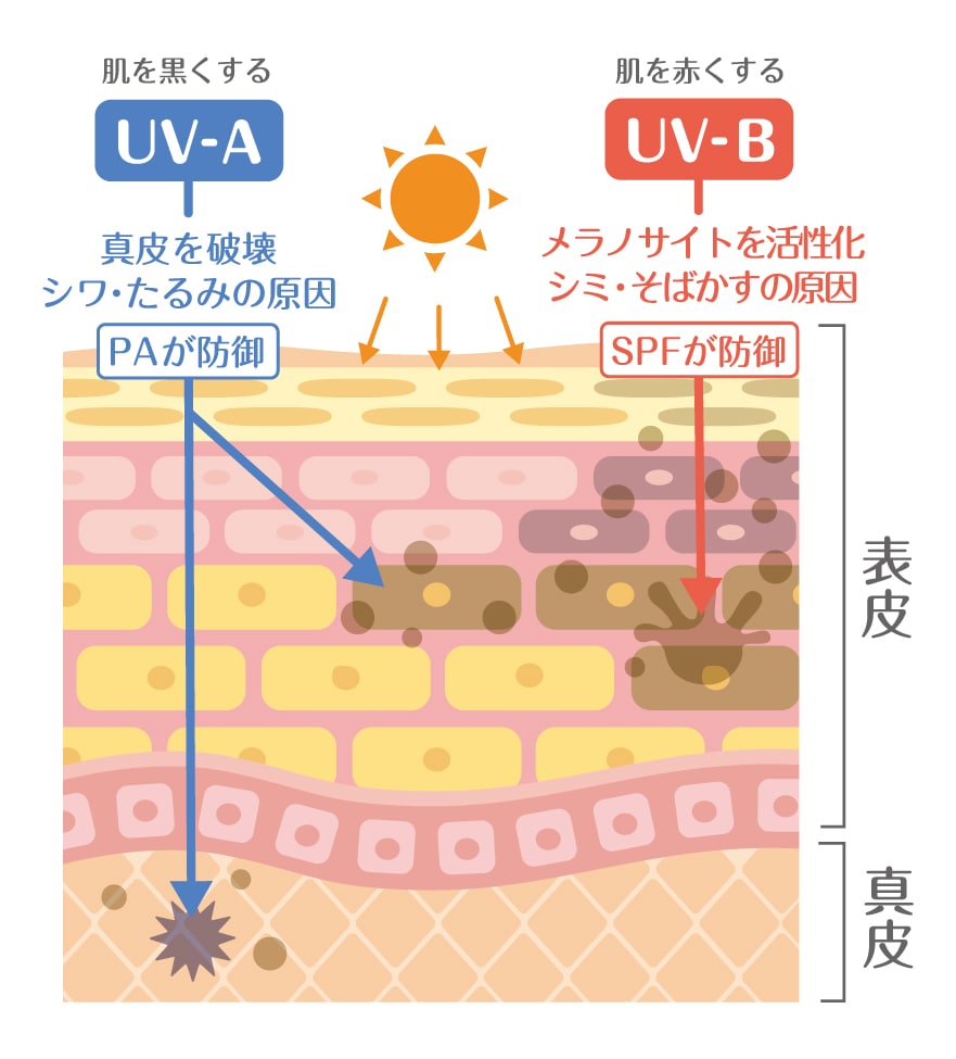 シワやたるみの原因になり、肌を黒くするUV-Aを防ぎます 。