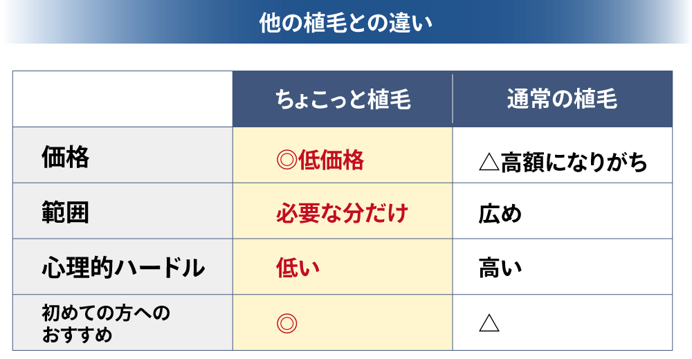 「ちょこっと植毛」は一部分だけの植毛ですので始めやすい植毛グラフト数、金額で初めて植毛をお考えの方にはおすすめです。
