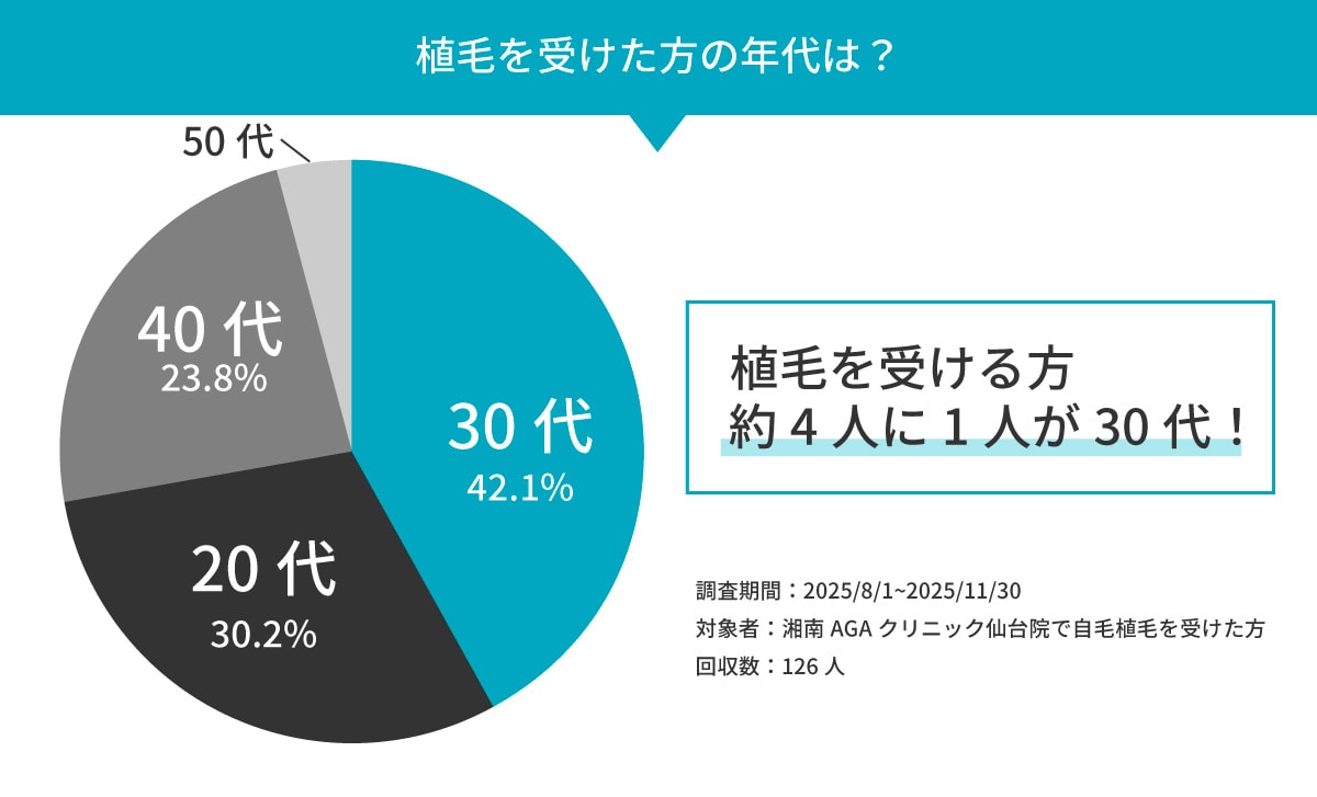 そんな悩みを抱えつつも、「植毛をするのはまだ早いのでは?」「周囲にバレるのが怖い」と一歩踏み出せずにいませんか?実は、30代は自毛植毛を受ける方が非常に多い年代です。若いうちに対策をすることで、より自然で理想的なヘアラインを維持しやすくなるというメリットがあります。