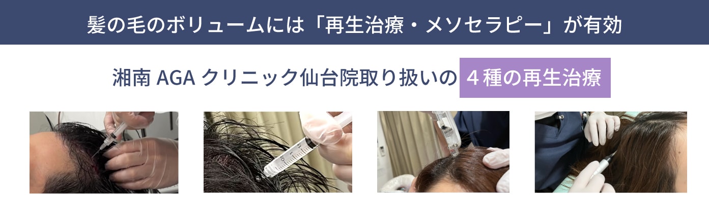 細く弱ってしまった毛や気になる頭頂の透け感を改善したい場合や、髪の毛をボリュームアップさせたい場合は再生治療・メソセラピーが有効です。