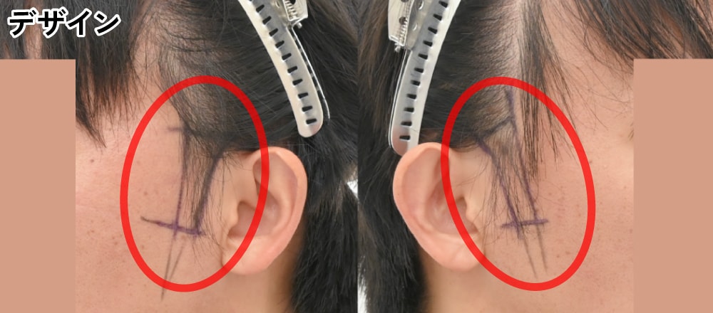 もみあげの植毛は、耳珠下の切痕と鼻翼の位置を基準に、平均的な形になるよう台形状にデザインしています。