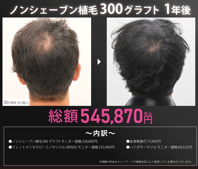 湘南AGAクリニックは、SBCグループ内で唯一、100グラフトからの少量植毛を実現できるクリニックです。さらに、費用面でも患者様の負担を軽減しており、73,550円から施術が可能です。このため、少しずつ薄毛を改善したい方や、費用を抑えて治療を始めたい方にもご好評をいただいております。
