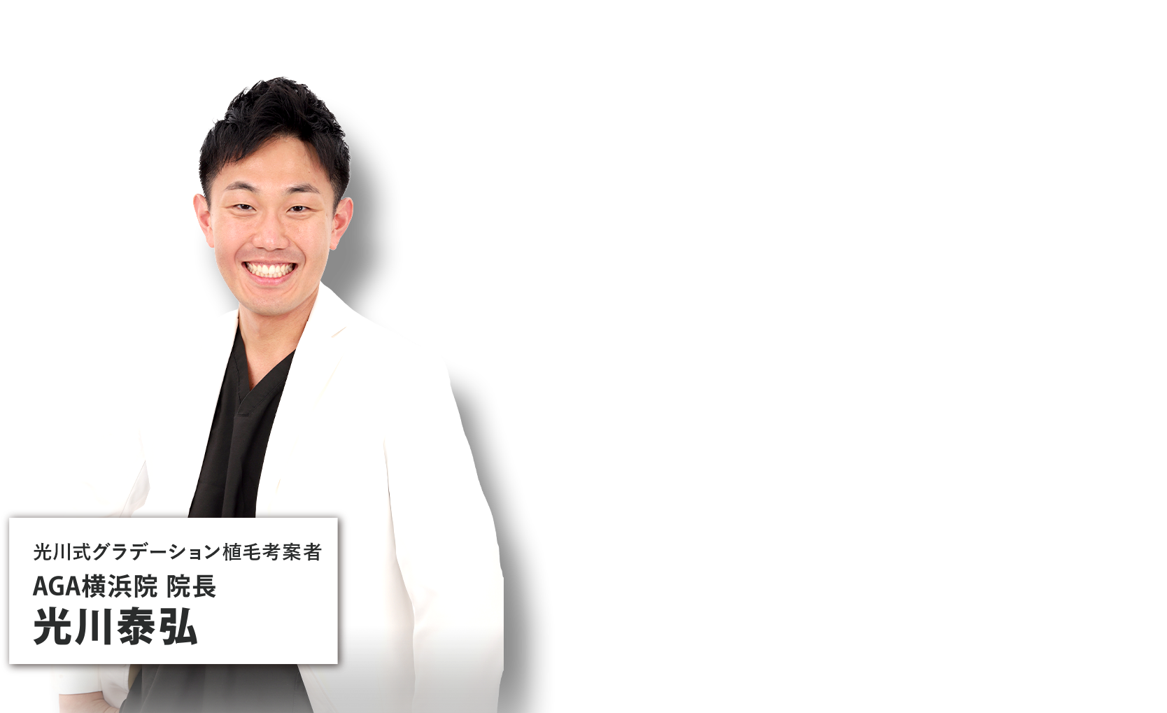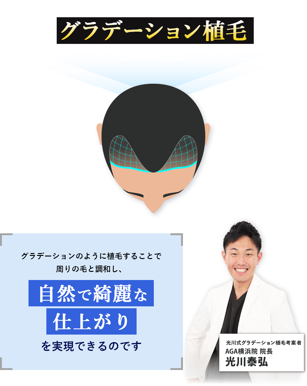 グラデーション植毛ができる唯一の医師院長光川はグラデーション植毛の考案者であり、唯一グラデーション植毛ができる医師です。お客様の頭皮状態や骨格を観察し、最適なデザインをご提案します。その結果どの角度から見ても美しく、綺麗な仕上がりを実現できます。