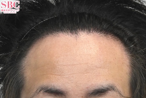 30代前半男性の症例です。20代前半から前頭部の後退を気にされておりました。眉の上縁から生え際までを測った額の広さは正中部分が約8.5cmであり、M字部分はそこからさらに右約1.5cm,左約1cm深い状態でした。植毛を行うこととし、ご相談の上で平均より少し控えめに額の広さ7.5cmとなるようにデザインしました。ハミルトン&ノルウッド分類 ) 3型治療)植毛術(975グラフト)経過)治療前→12ヶ月後結果)植毛術後12ヶ月のお写真で、デザイン通りのヘアラインが形成出来ています。