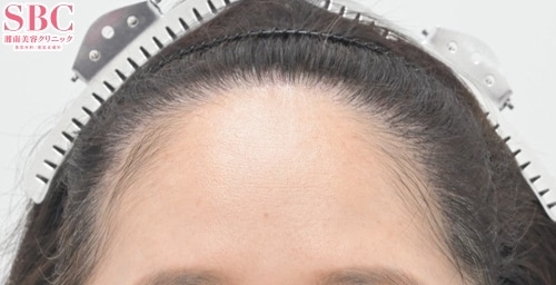 この方は、40代の女性です。この方は生まれつきの額の広さを狭くしたいと当院にご相談に来られました。肉眼にて、平均の女性らしい生え際に比べて、M字が約3.0センチ深く、中央で1.5センチ広くなっています。マイクロスコープにて、平均のヘアライン近傍にはあまり軟毛が認められず、植毛術が適応であると判断しました。Ludwig Scale)II 型治療)植毛術(1400G)(ノンシェーブン法)、毛根再生注射、ハイポサーマソル、女性用タブレットセット経過)治療前→6ヶ月後結果)植毛術から6ヶ月です。自然なヘアラインが形成されてきています。薬の併用によって、生え際に産毛変化が認められ、それが自然なヘアラインに見た目を変えています。薬の併用は女性もおすすめです。