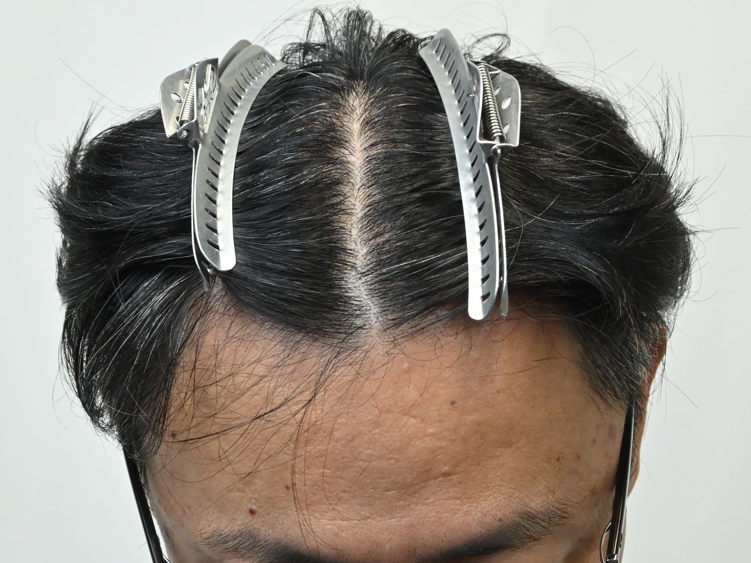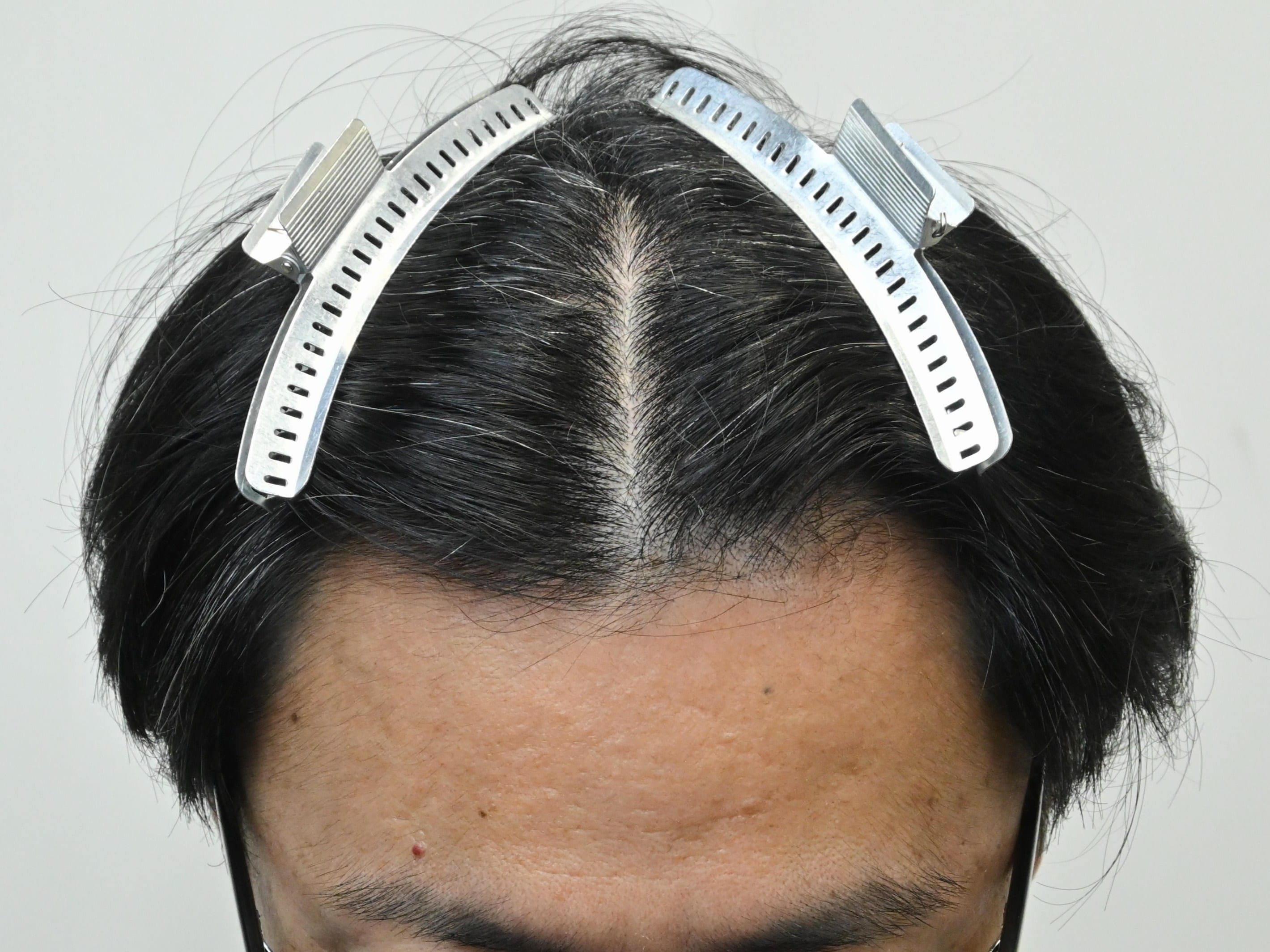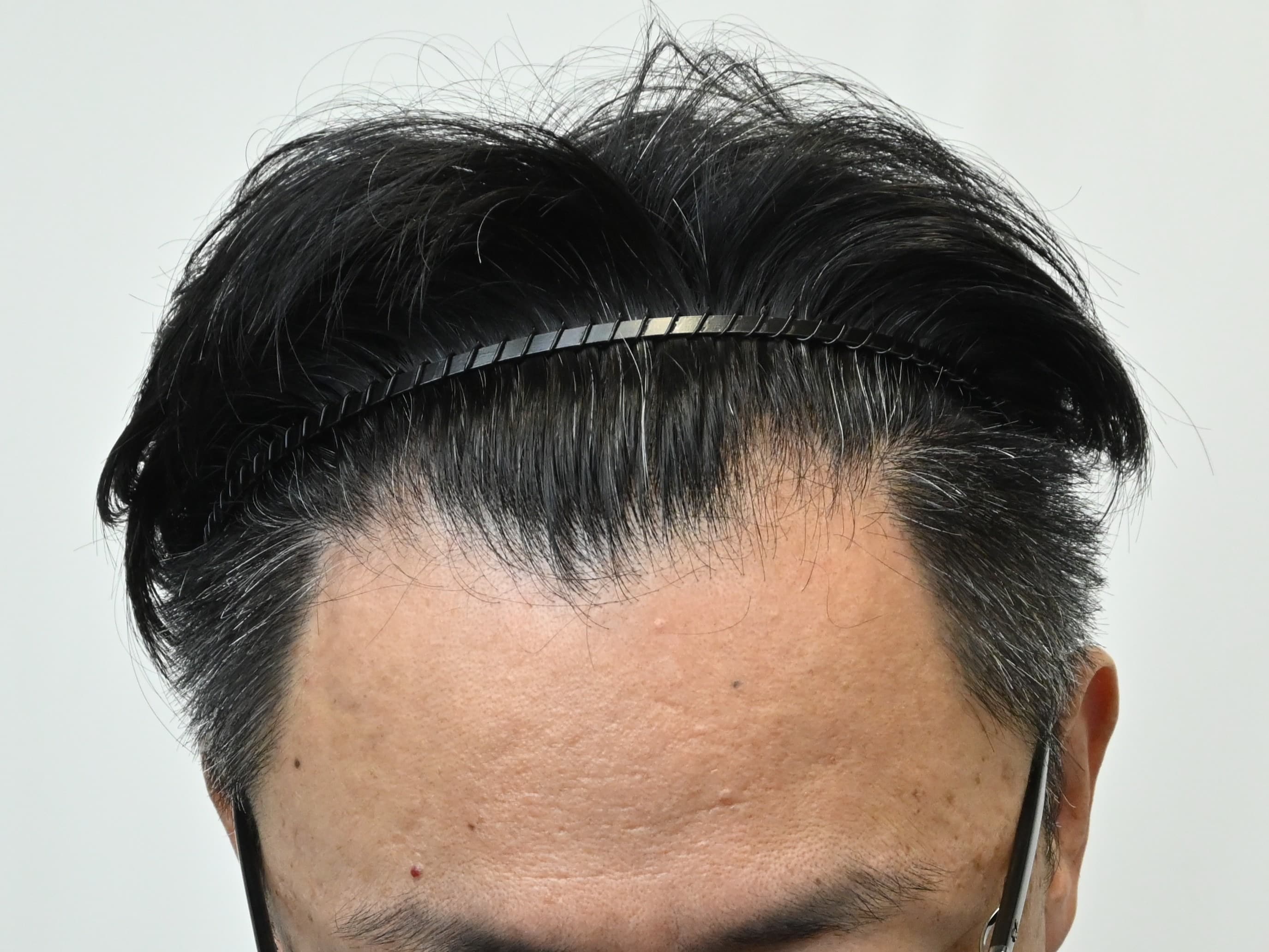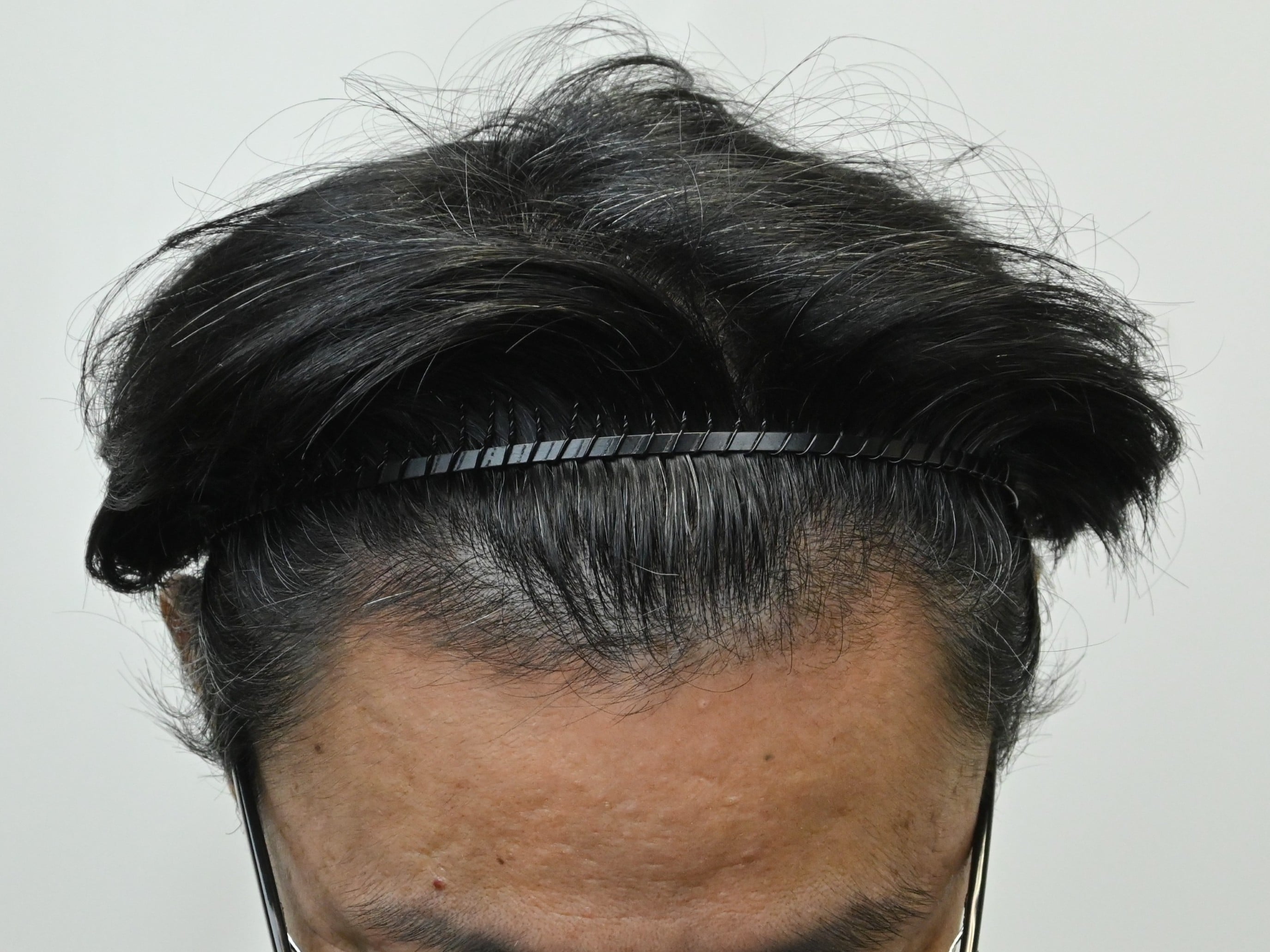 50代男性、治療歴なし、分け目が気になり生え際の改善希望の方です。毛根再生注射1回、AGA治療薬の内服で治療を開始されました。治療開始から3か月後の経過です。生え際だけでなく、全体的に密度増加を認めました。M字の分け目は密度が増加したため、目立たなくなっています。まだ治療開始3ヶ月ですので、今後のさらなる改善に期待しています。