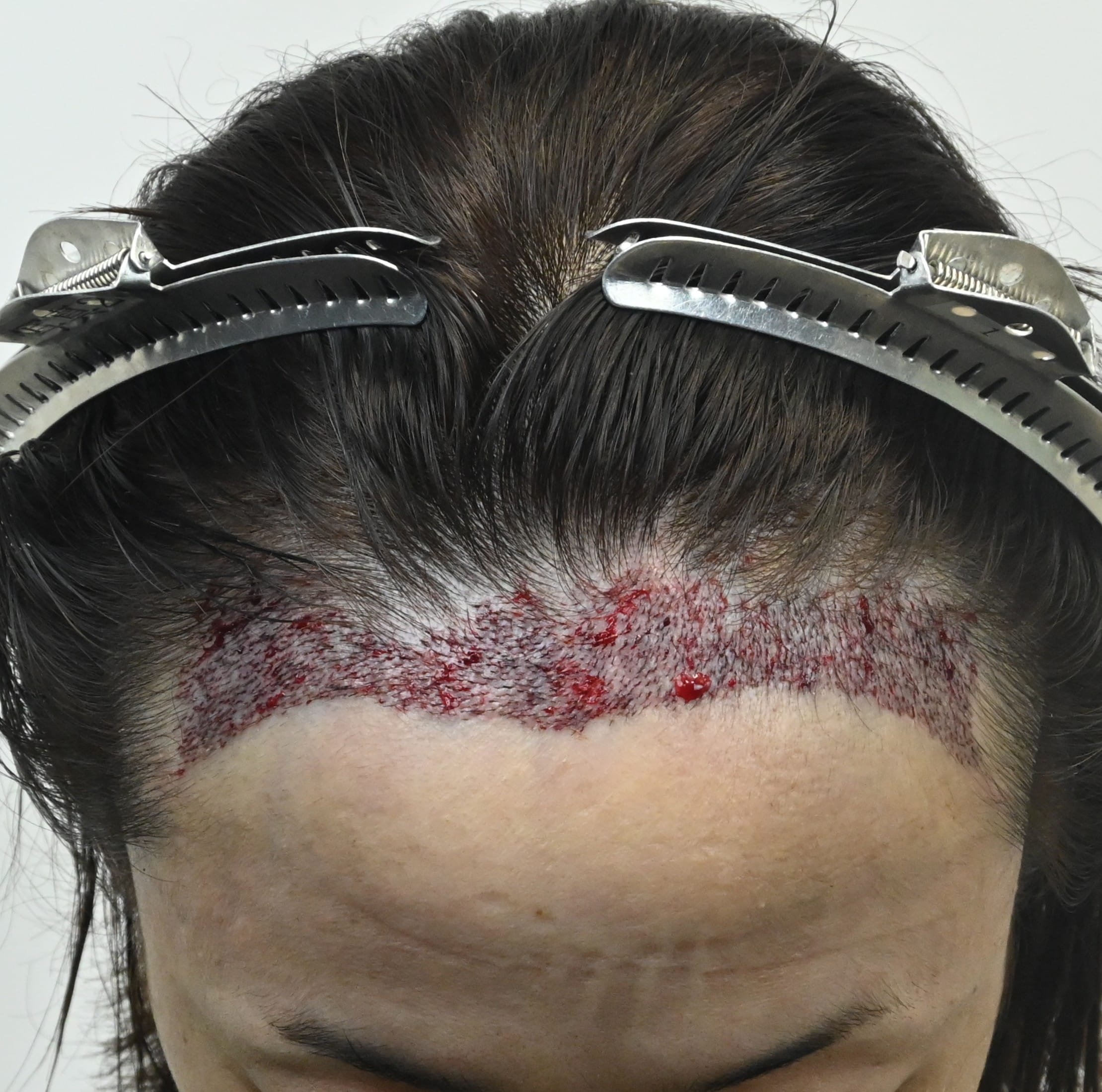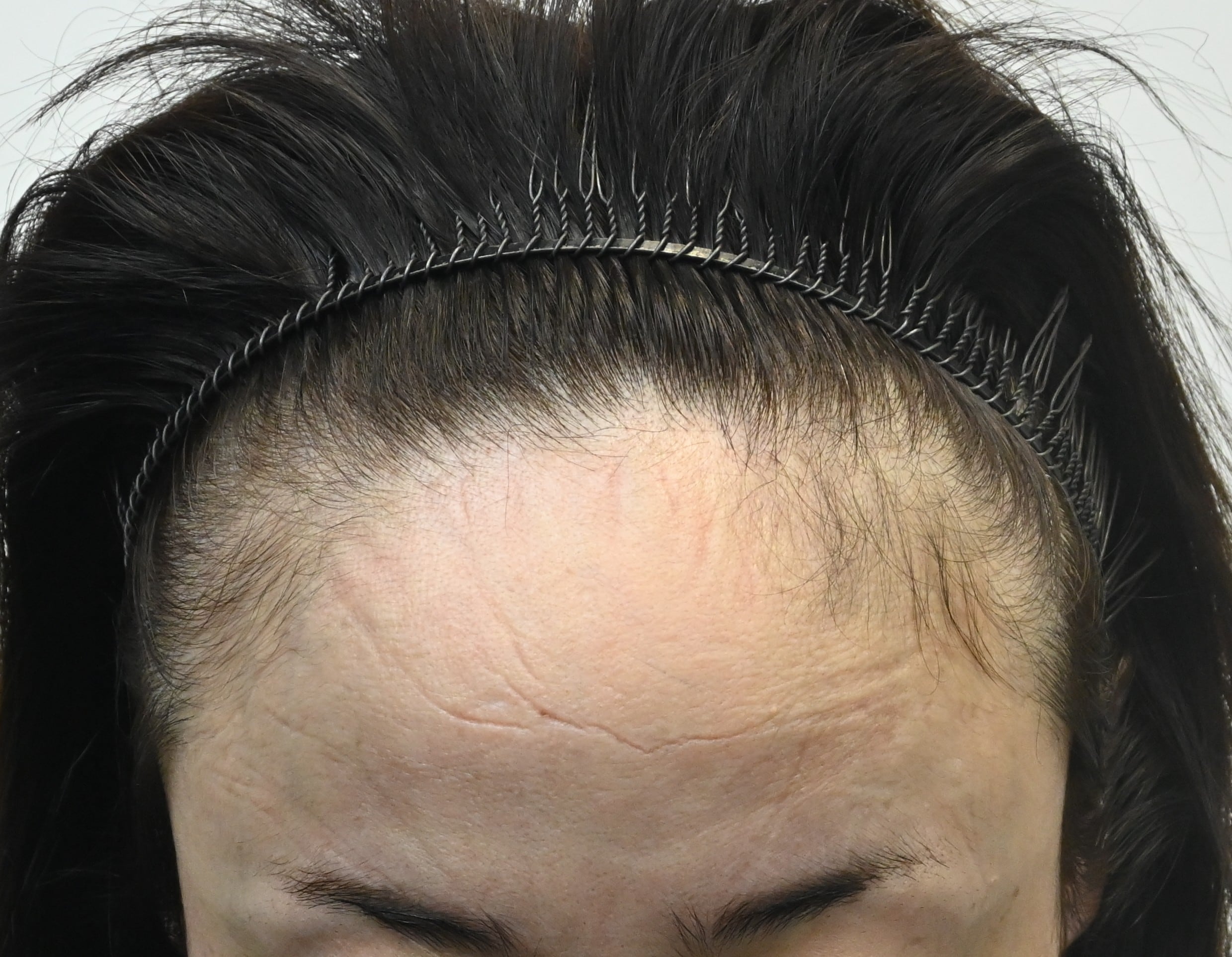 症例概要)40代前半女性の植毛症例です。生まれつきの額の広さを気にされてご来院されました。額の広さが約6㎝になるようにデザインし、植毛を行いました。治療)植毛術(1250G)経過)治療前→治療直後