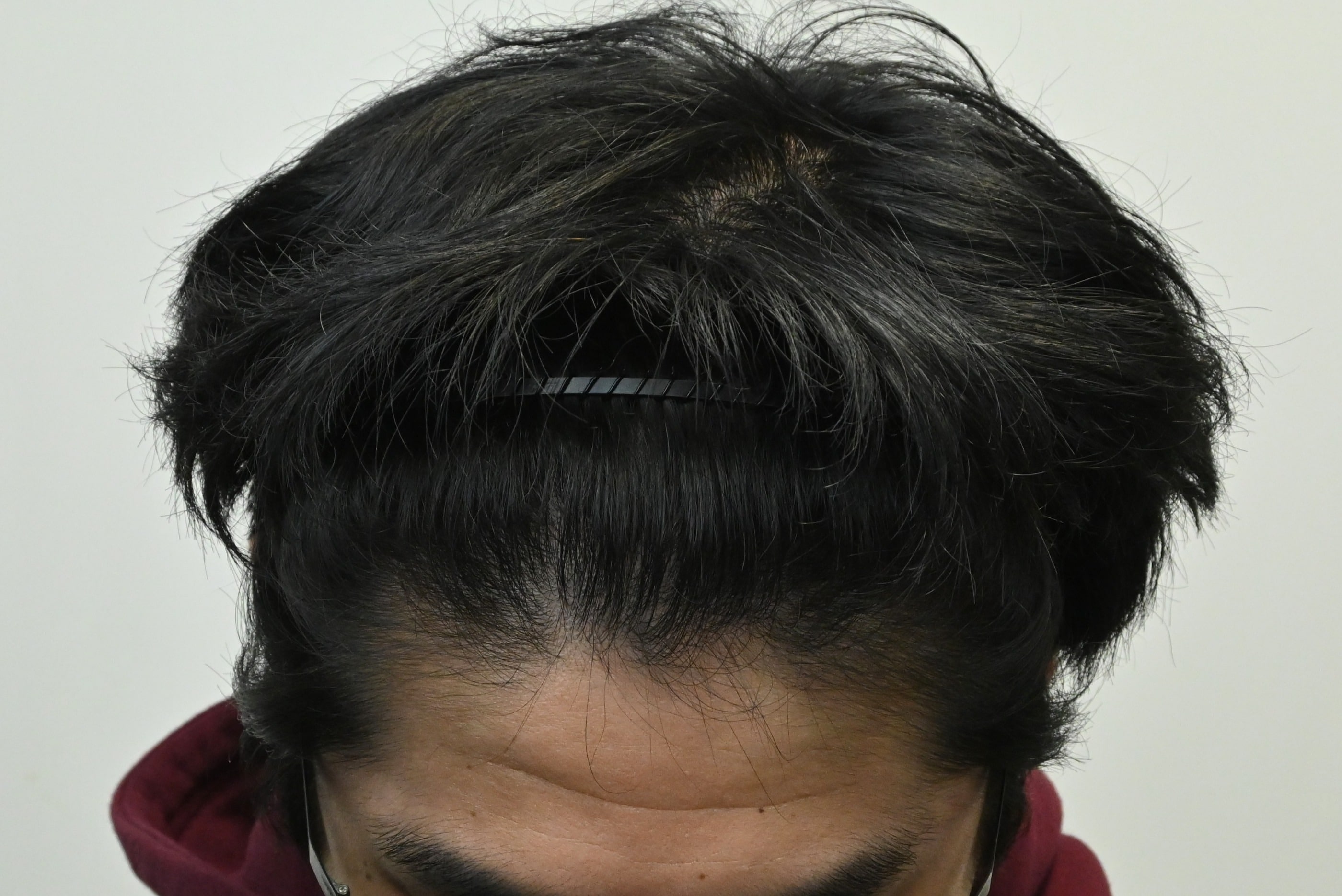 20代男性、治療歴なし、全体的に透け感が気になり来院された方です。発毛レーザーFolix、AGA治療薬の内服で治療を開始されました。治療開始から6ヶ月、Folixを4回照射後の経過です。全体的に密度増加を認めました。まだ治療開始6ヶ月ですので、今後のさらなる改善に期待しています。